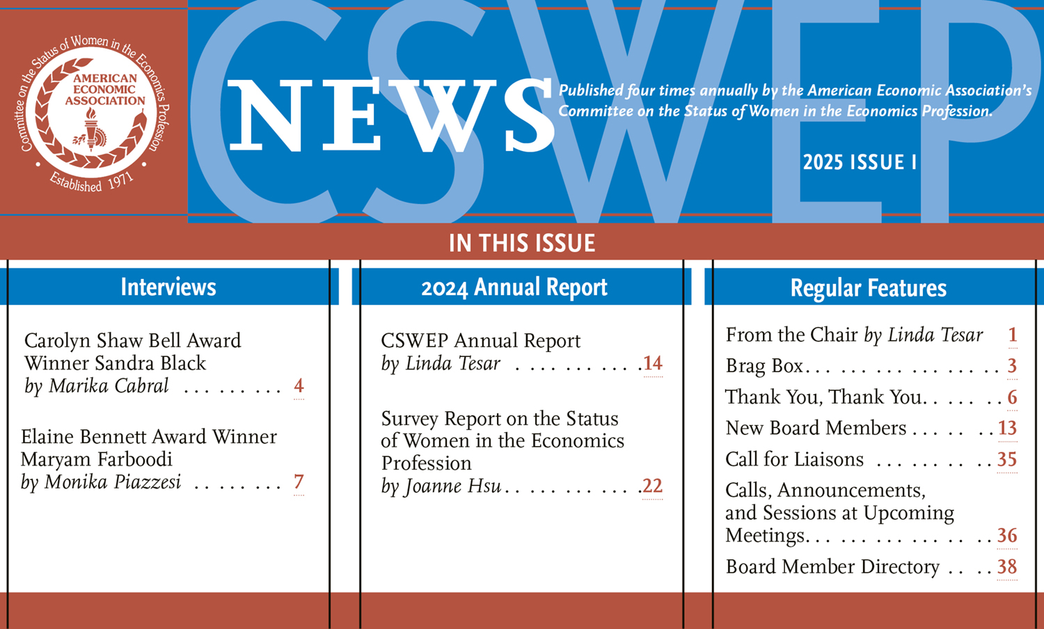 The first issue of each year includes the CSWEP Annual Report and interviews with recipients of the Carolyn Shaw Bell Award, the Elaine Bennett Research Prize, and the Janet L. Yellen Award for Excellence in Public Service.