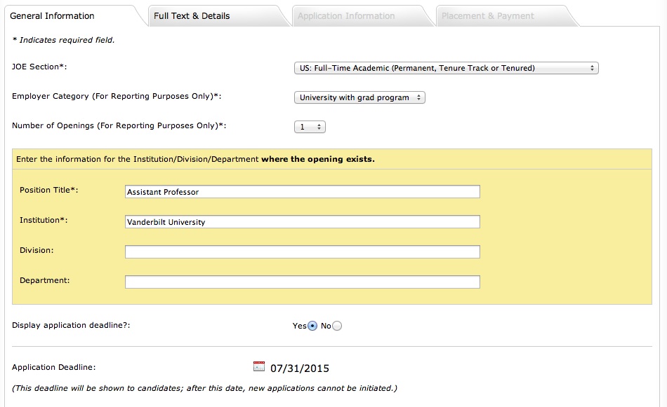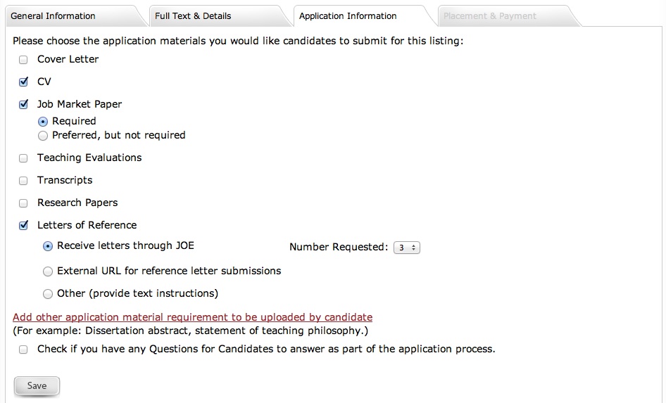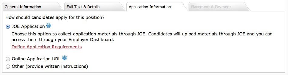 The third tab is where you indicate how candidates should apply for your listing. You can now accept applications and/or reference letters through JOE, by choosing the "JOE Application" option!