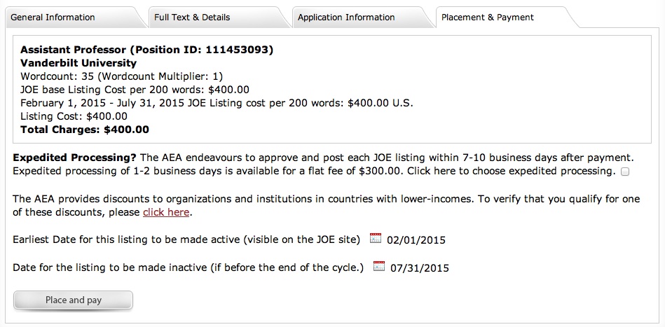 Standard processing means that a listing will be posted within 7-10 business days of being paid, and expedited processing (posting within 1-2 business days) can be selected for an additional fee. Once listings are posted, they will be available for the rest of the JOE cycle or until you set them to become inactive, so you don't need to renew your listing each month.