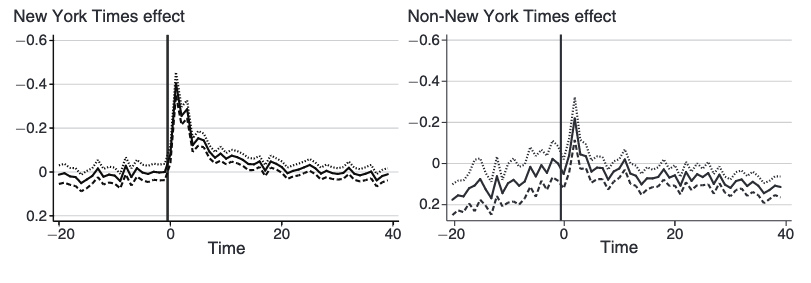 The figures below show the impacts from a New York Times (left panel) and other major professional review (right panel) for 20 days before and 40 days after the review. The left panel shows that a Times review delivers an immediate improvement in the sales rank. The log rank improves by 0.4, then returns to its baseline about two weeks later. Other professional reviews also have a sizeable impact, though not as much as a Times review. (The y-axes are reversed to reflect that sales move inversely with sales ranks.)