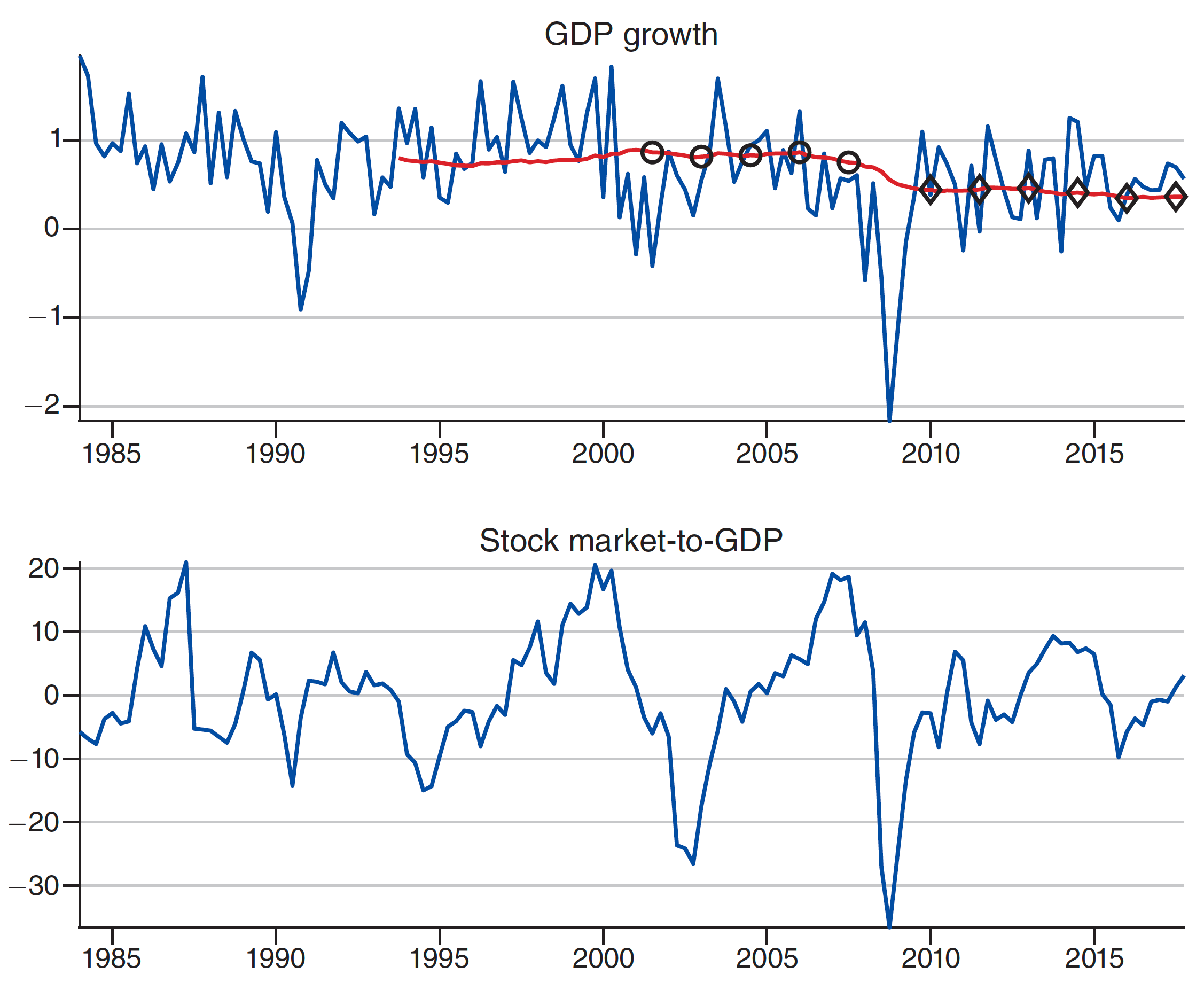 The chart below shows quarterly US data on GDP growth and the stock market to GDP ratio from 1984 to 2017. The red line—a 10-year rolling-window average—shows that GDP growth slowly declined from the 1990s to after the Great Recession in 2008.