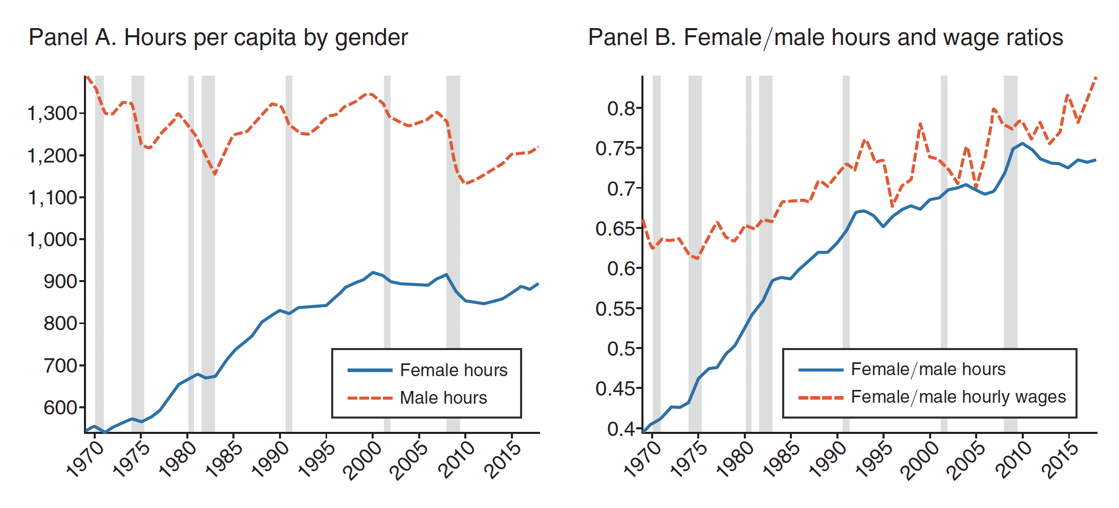 The chart below shows female and male yearly aggregate hours per capita (Panel A), and the female-to-male ratio of hours per capita and hourly wages (Panel B).