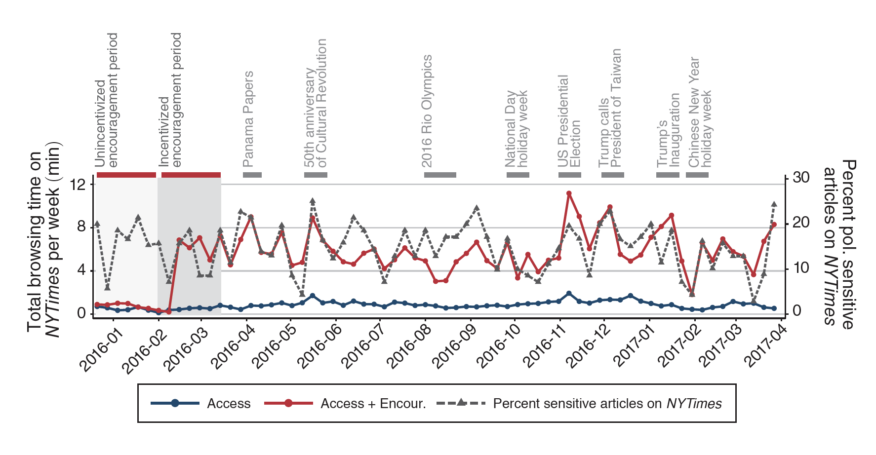 The chart below shows the time that students spent browsing the New York Times during the 18 month experiment. The red line represents the students who got free Internet access and encouragement to read about current events. The blue line represents the students who only got free access. The dotted line (y-axis on the right-hand side) indicates the proportion of articles published on the New York Times that were politically sensitive during a week.