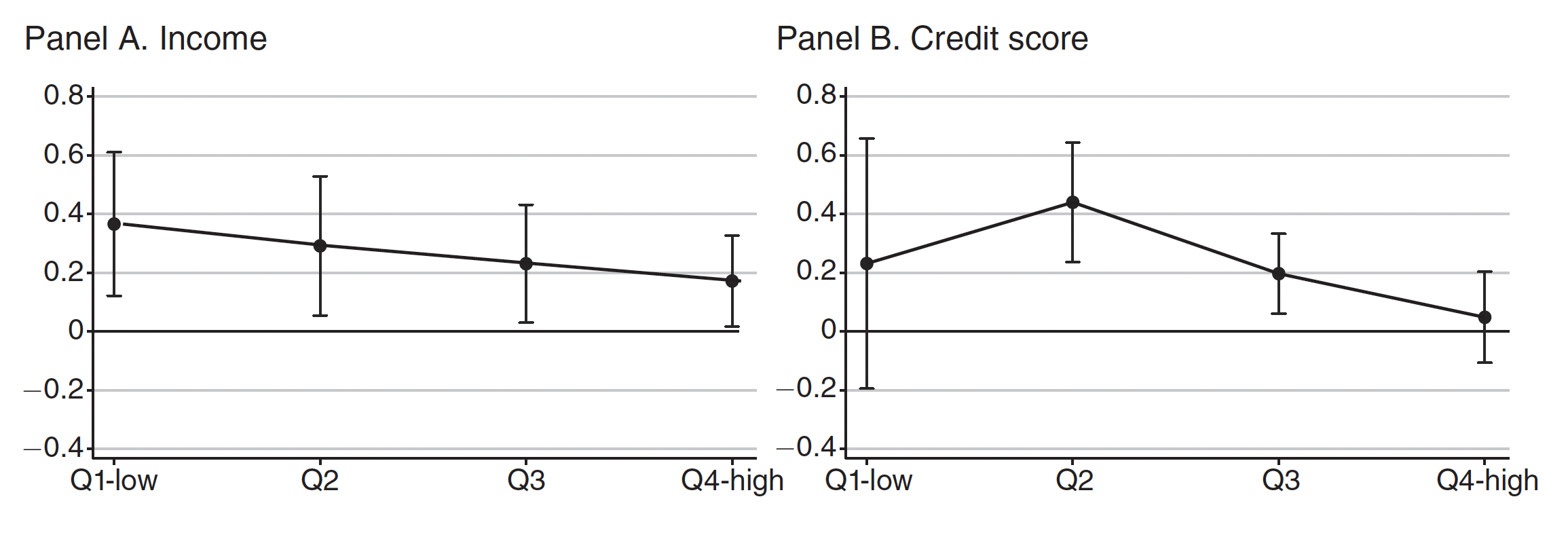 Panel B shows a similar pattern across credit score quartiles. Although the trend is not perfectly monotonic, borrowers with lower credit scores generally experienced larger interest rate increases than those with higher scores.