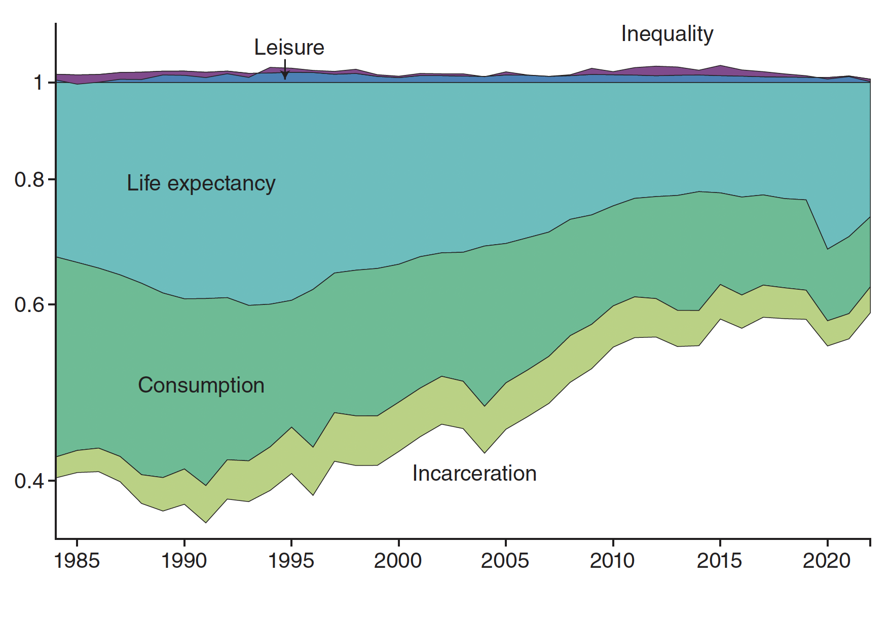 The authors constructed what economists call a consumption-equivalent measure of welfare, which incorporates life expectancy, consumption, incarceration rates, leisure time, and inequality. Because different economic outcomes are measured in different units, direct comparisons are difficult. By converting everything into consumption-equivalent terms, the researchers were able to assess the relative importance of these various factors.