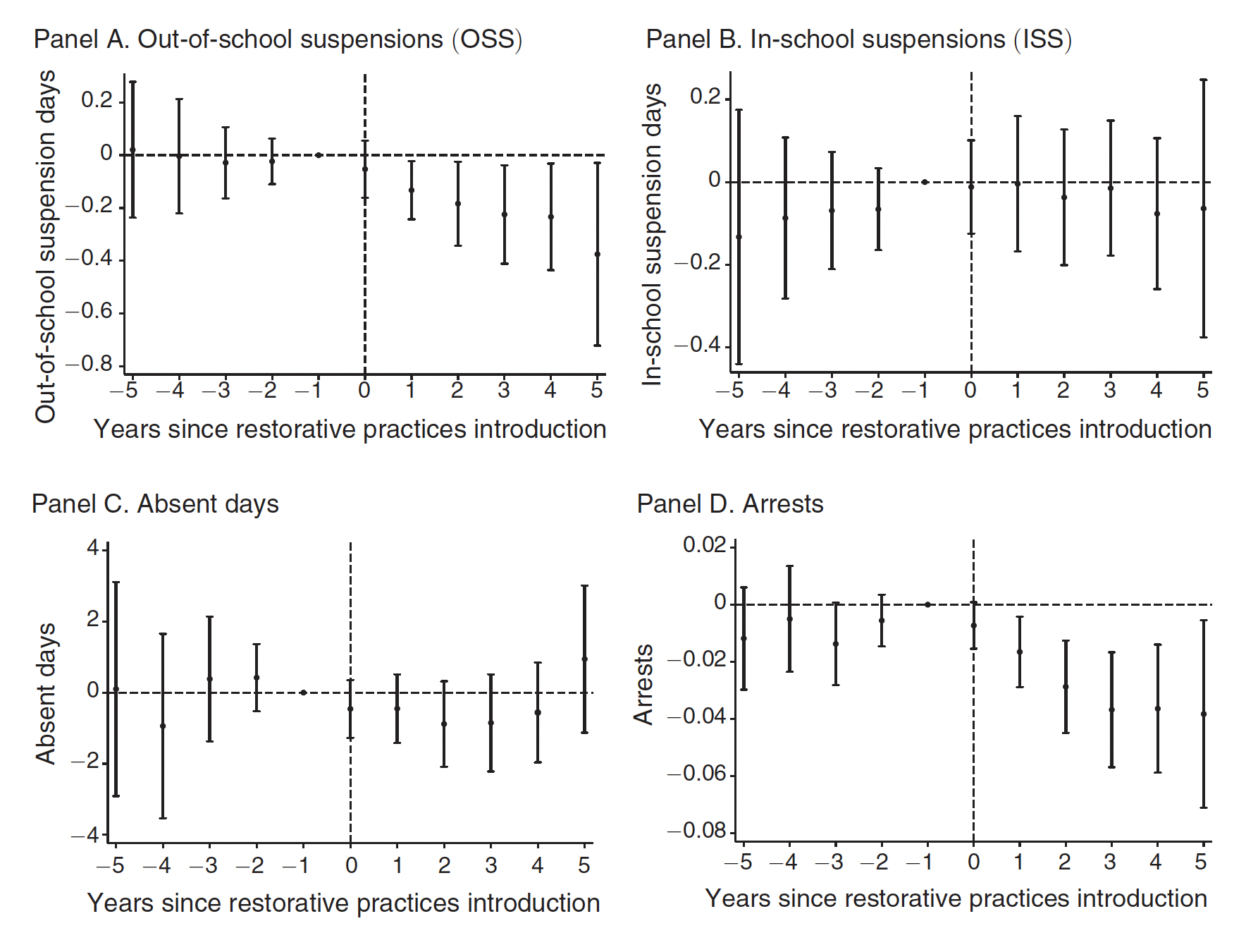 Figure 1 from the authors’ paper shows estimates of several student outcomes over an 11-year window centered on when the schools introduced restorative practices (indicated by the dashed vertical line at year 0).