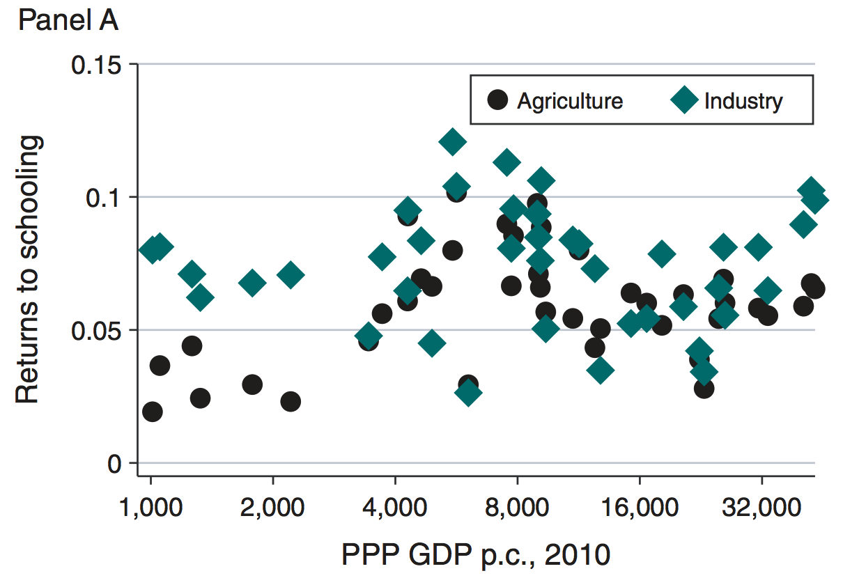 Instead, the authors stress the role of education. They examine data from 13 countries, ranging from Indonesia to the United States, and find that agricultural workers have fewer years of schooling than workers in other industries. Moreover, agricultural workers get a lower return on their education, as shown in the figure below.