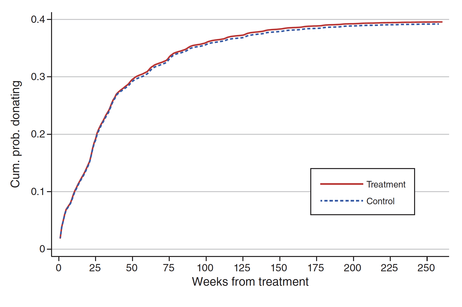 The dashed blue line represents new donors who didn’t receive thank-you calls. This series shows that the probability of donating again increases rapidly during the first fifty weeks and then gradually levels off at around 40 percent. The solid red line represents new donors who did receive calls, and this series follows a nearly identical pattern, indicating that the calls had no effect on giving behavior.