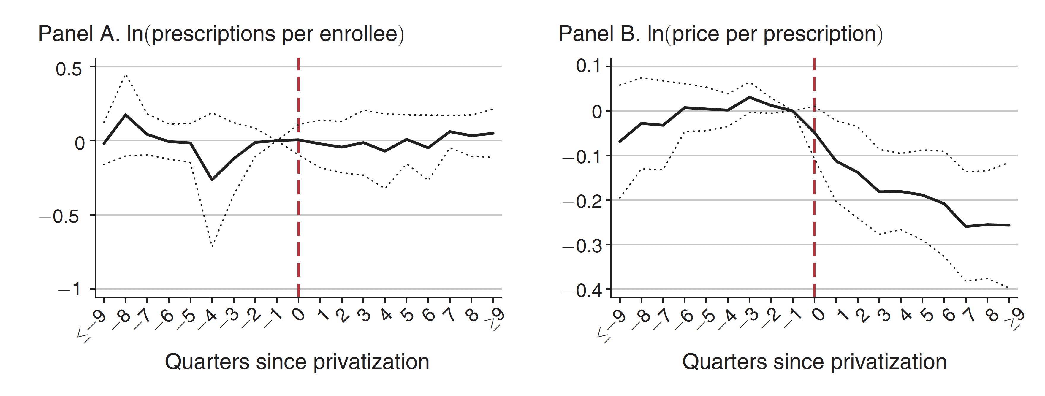 Panel A shows the log change in prescriptions written per enrollee. And Panel B shows the log change in drug price per enrollee. The dashed red vertical line separates the post-privatization prescriptions and prices from the post-privatization prescriptions and prices. (The dotted lines are 95 percent confidence intervals.)