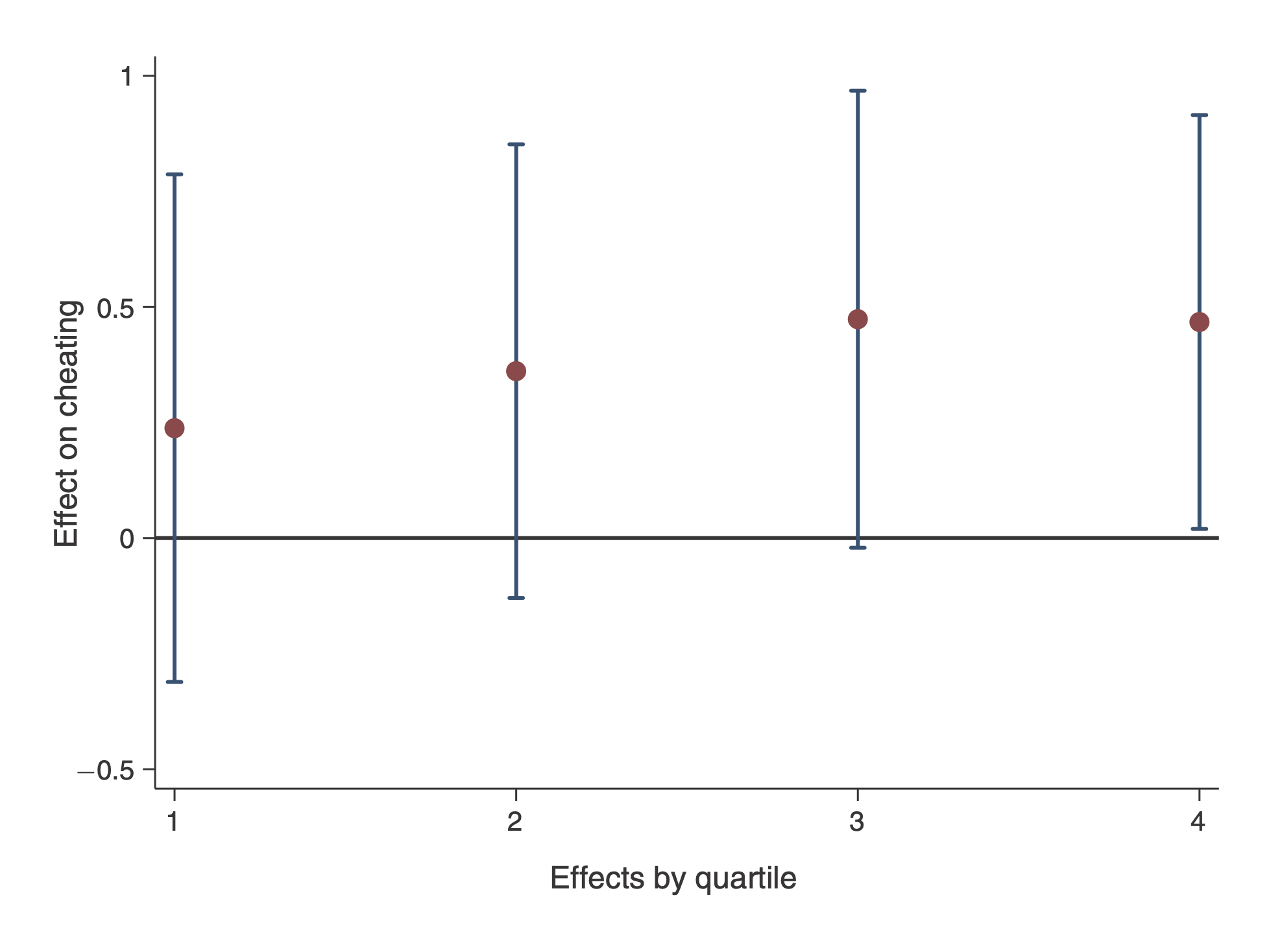 At lower levels of corruption, there is a positive but insignificant effect on cheating rates in schools. That effect increases as corruption becomes more salient and is significant at the highest quartile of corruption.