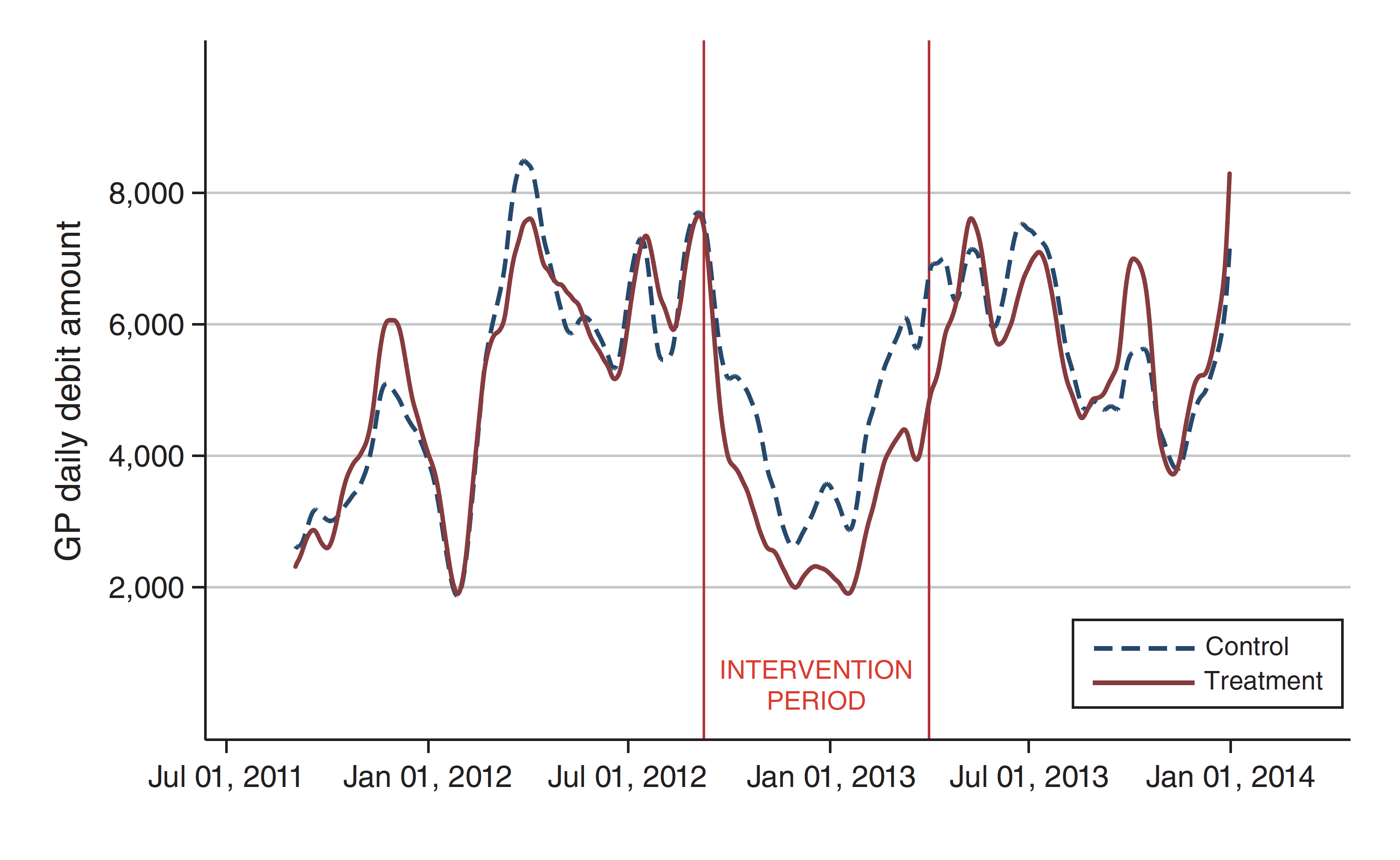 The data shows that there is a clear, sustained drop in the level of spending in the treatment group over the intervention period.