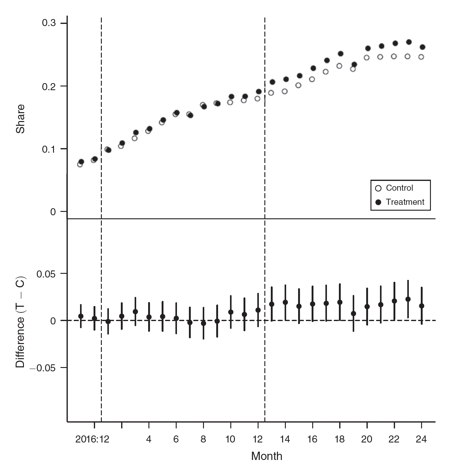 During the first year of the experiment (between the two dashed vertical lines), the employment share in the control group (hollow circle) rose from 8 percent to 18 percent. Employment in the treatment group (solid circle) followed the same trajectory, and none of the monthly estimates measuring the difference between the groups differ significantly from zero.