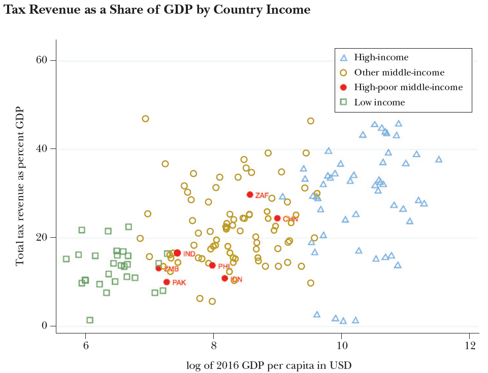 The figure above shows the tax capacity in most high-poverty middle-income countries is as low as in many low-income countries. Tax revenue collected by Pakistan, India, and Zambia — represented by red dots — are below 20 percent of GDP, just as it is for poor countries like Somalia or the Democratic Republic of the Congo. In 2015, high-poverty, middle-income countries collected 16.9 percent of their GDP as tax revenue, versus 13.3 percent in low-income countries.