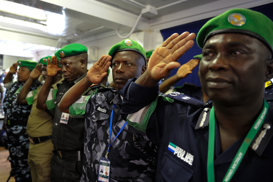 AMISOM Police Officers salute to the guests during a medal award ceremony for the Kenyan Formed Police Unit in December 2014.