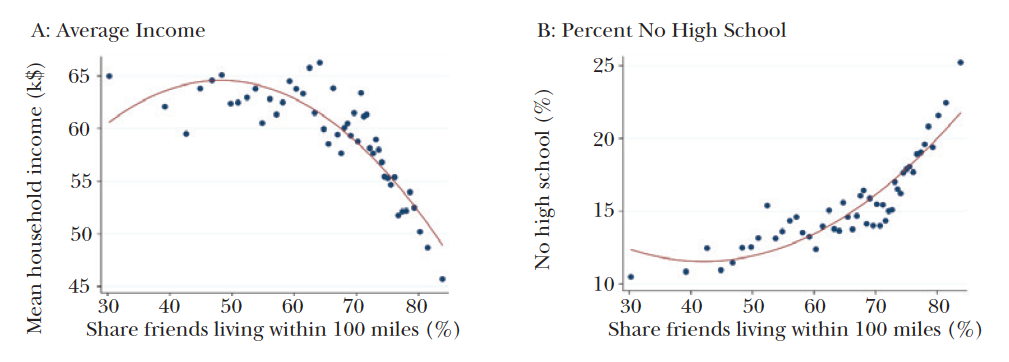 Figure 3 from their paper shows the relationship between geographic distribution of social networks of a county and county-level socioeconomic measures. Panels A and B show average income and the share of population with no high school education. Counties with a lot of Facebook friends who live close by (within 100 miles) tended to have lower incomes and high school graduation rates than counties with a greater share of friends who live far away.
