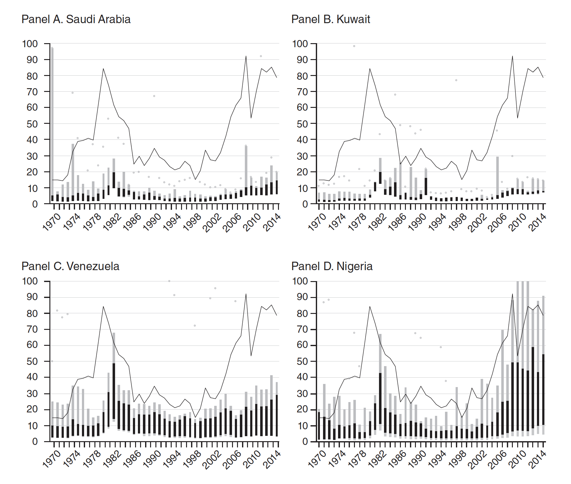 The panels show the production costs for four different OPEC members. The solid black line in each panel is the oil price in dollars. Each black bar ranges between the fifth and ninety-fifth percentiles of production cost for a barrel of oil in a year. The gray bars combined with the black bars show the range of costs between the first and ninety-ninth percentiles. The light grey dots represent the highest-cost barrel produced for the year.