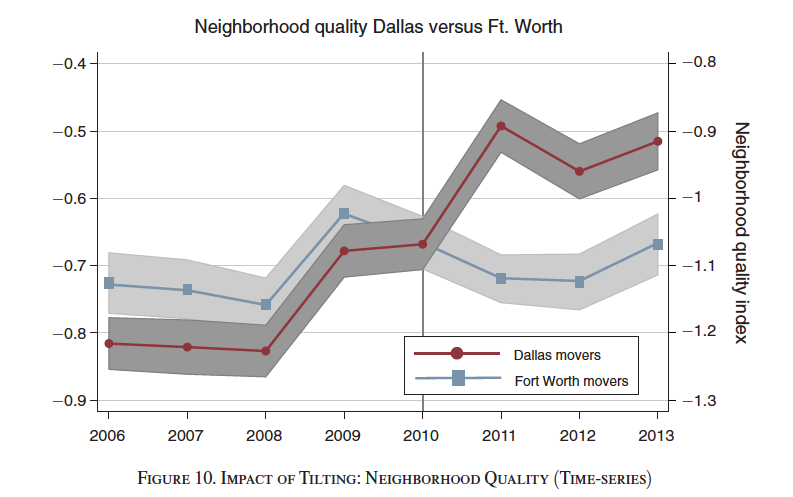 The figure above plots their results. Neighborhood quality — which takes into account poverty rate, test scores, unemployment rate, the share of kids with single mothers, and violent crime — is plotted along the y-axis and the years before and after the policy are on the horizontal axis. The vertical line marks the last year before the policy change went into effect in Dallas.