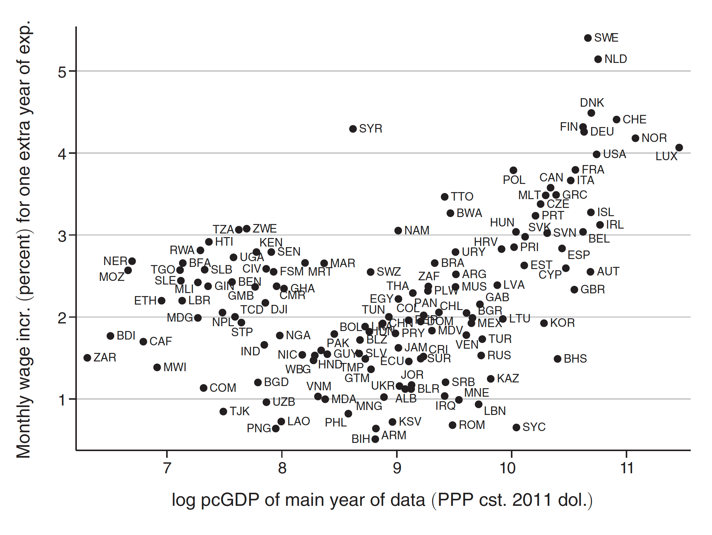 The x-axis indicates the logarithm of per capita GDP at purchasing power parity and constant 2011 US dollars; the y-axis indicates the estimated percentage increase in monthly wages for an additional year of work experience.