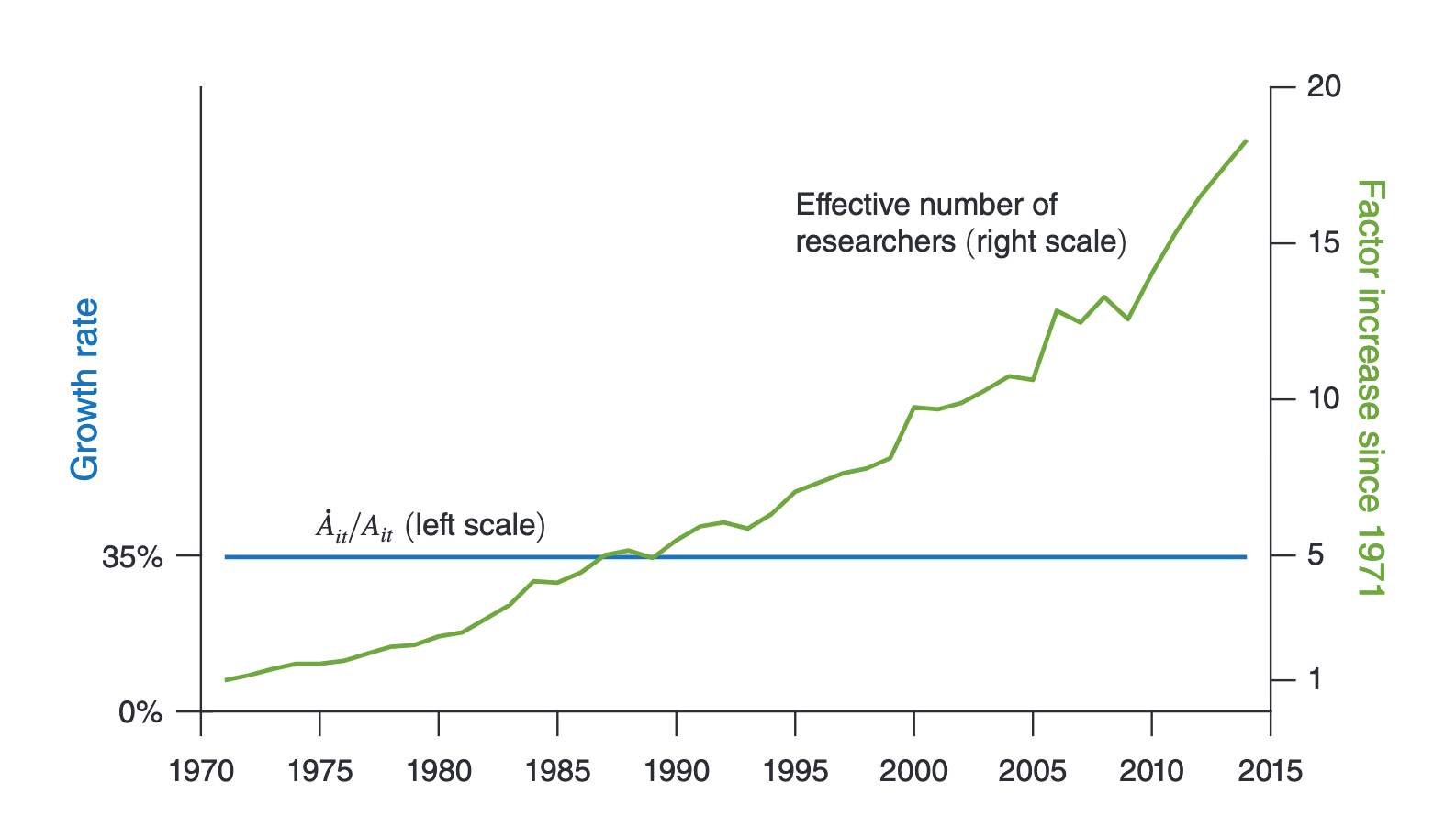 The authors looked at research productivity and Moore’s Law, which states that the number of transistors packed onto a computer chip doubles every two years. That translates to a constant exponential growth rate of 35 percent a year.