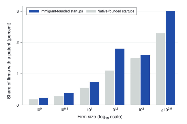 Figure 4 from their paper compares patenting activity from immigrant-founded firms with startups headed by native-born entrepreneurs. Examining tax and Census data combined with patenting records, the chart shows the share of firms that owned at least one patent, going left to right in size from smallest to largest. Overall, companies founded by immigrants (blue bars) were 35 percent more likely to have a patent than firms with a native-born founder (gray bars). This advantage carried across all firm sizes and was especially strong among the largest companies.