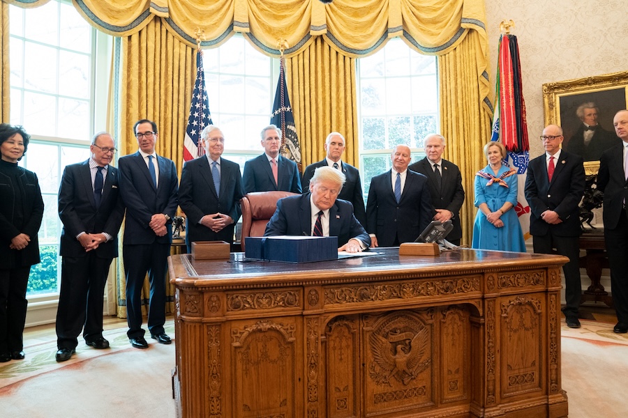 President Trump signs a $2.2 trillion assistance package to help American workers, small businesses, and industries hurt by the economic disruption caused by the COVID-19 outbreak.
