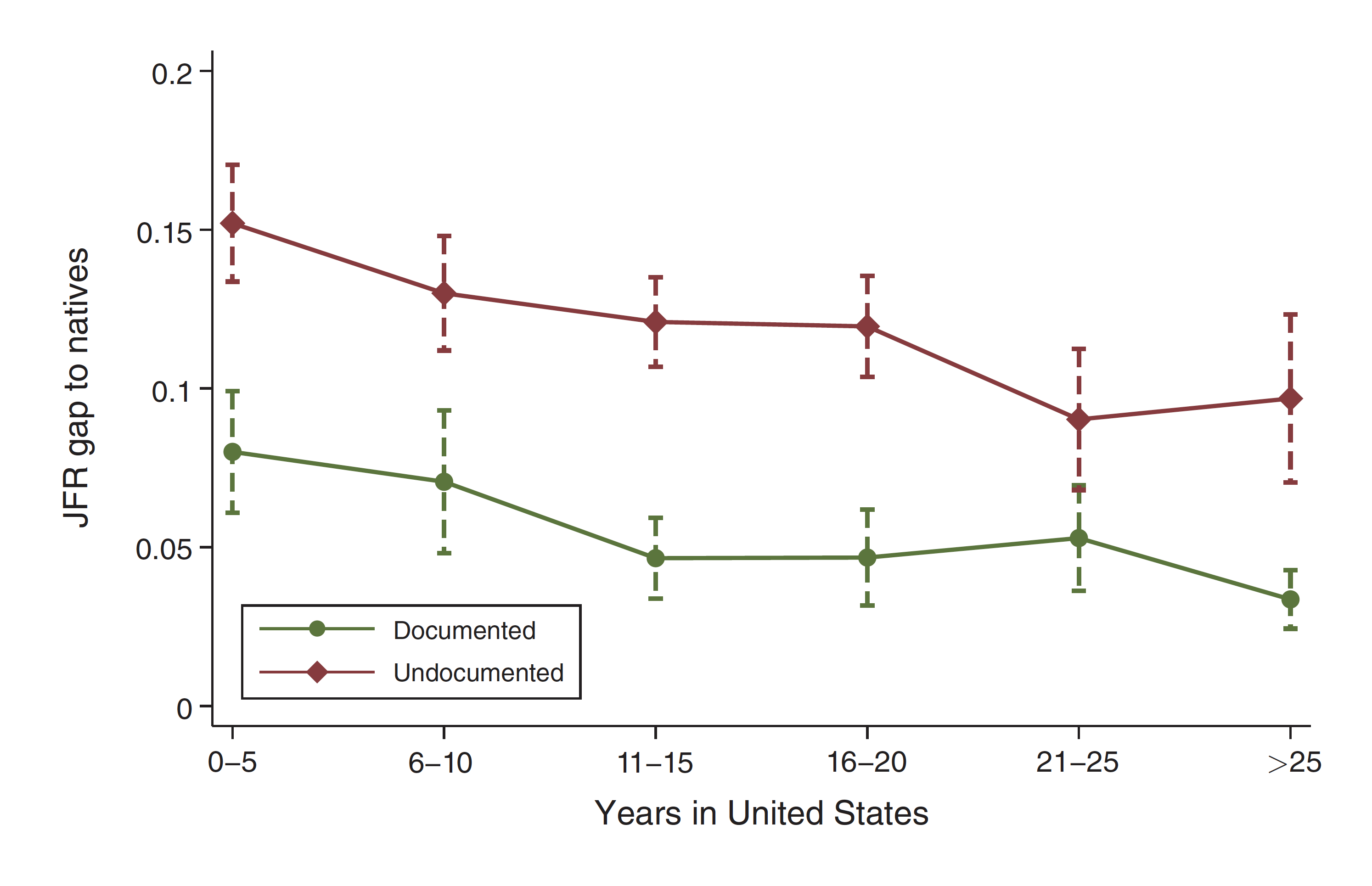 The job finding rate is the share of unemployed workers who found jobs over a month-long period, averaged over a year. For instance, documented immigrants (green line) who have been in the US between 0 and 5 years were roughly 8 percentage points more likely to find a job than natives. For the undocumented workers (red line) in the country less than 5 years, that number jumps to 15 percentage points.