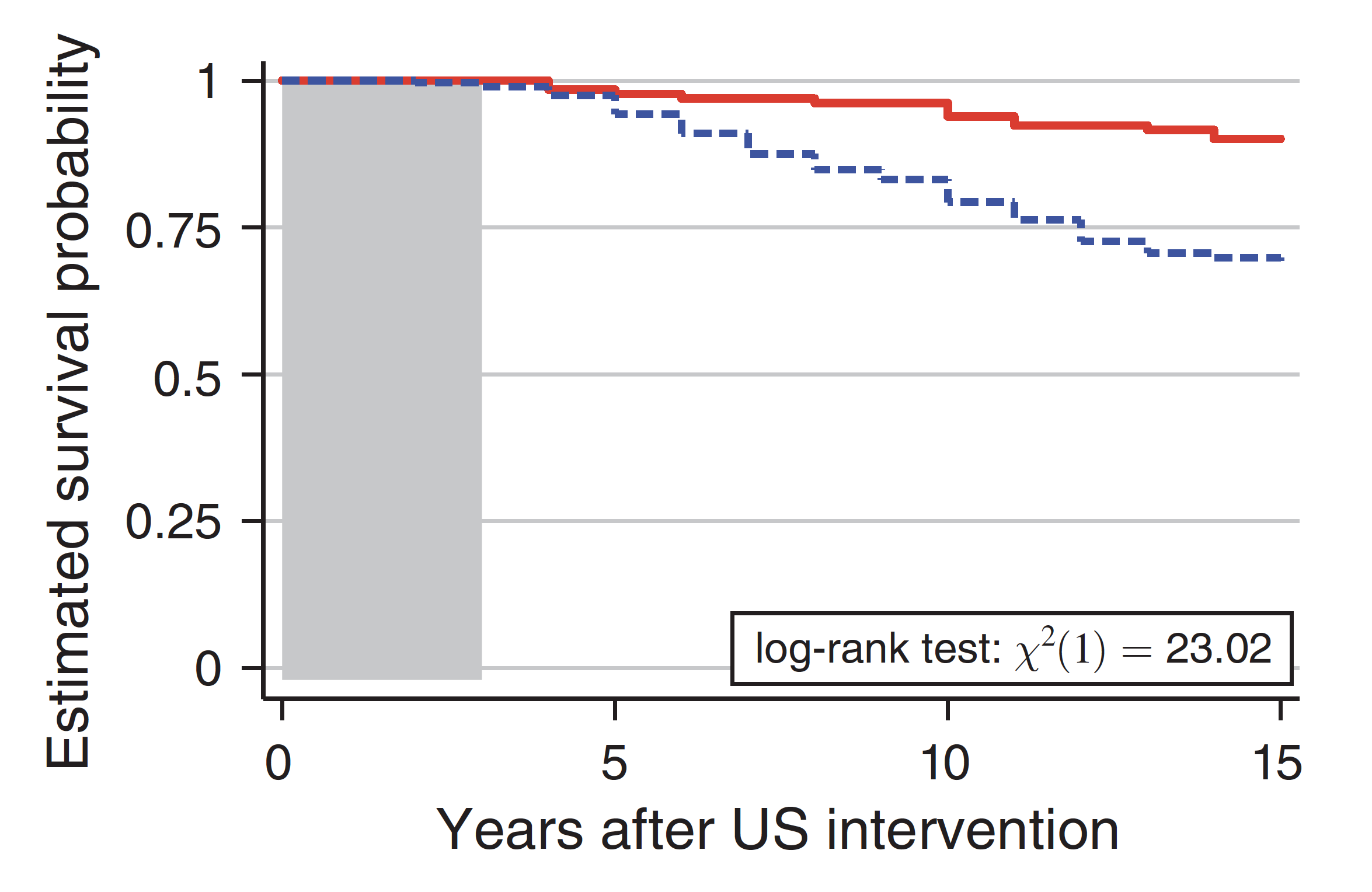 The red line shows the probability that a firm from a participating province was still in business after management training. The blue dashed line represents the survival rates of firms from provinces that weren’t eligible.