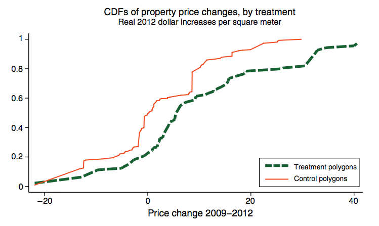 The figure above estimates the impact that the infrastructure investments had on real property prices between 2009 and 2012. It tracks the cumulative distribution function, or "CDF," of the changes in real property prices in neighborhoods that received the upgrades (the green dotted line) compared to a control group where no improvements were made (the solid orange line).