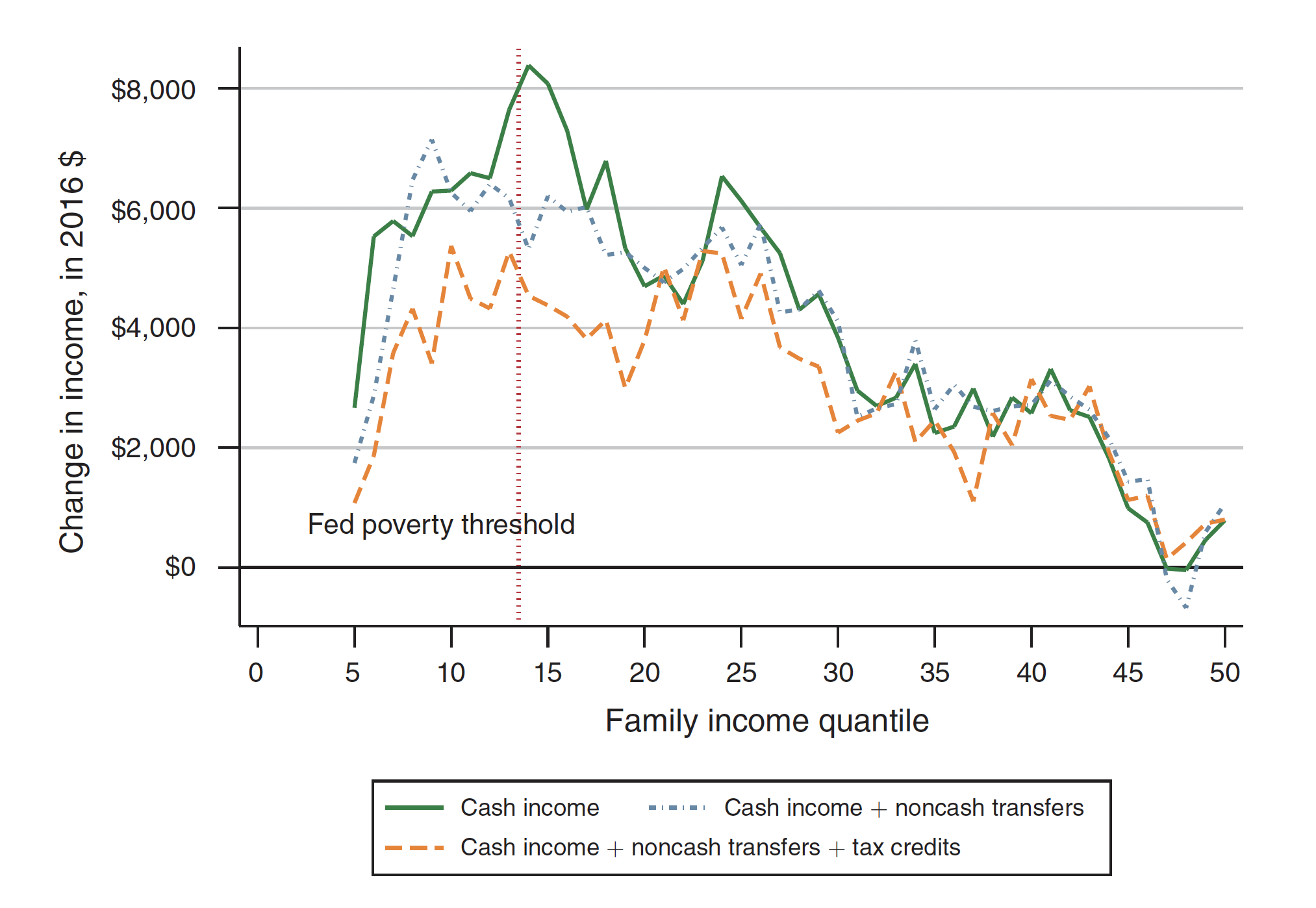 The green line shows how much cash income would increase. The dashed blue line includes noncash transfers like food stamps and housing subsidies. And the dashed orange line further includes tax benefits such as child tax credits. (The vertical dashed red line indicates the federal poverty threshold—an average of $22,476 in this sample.)
