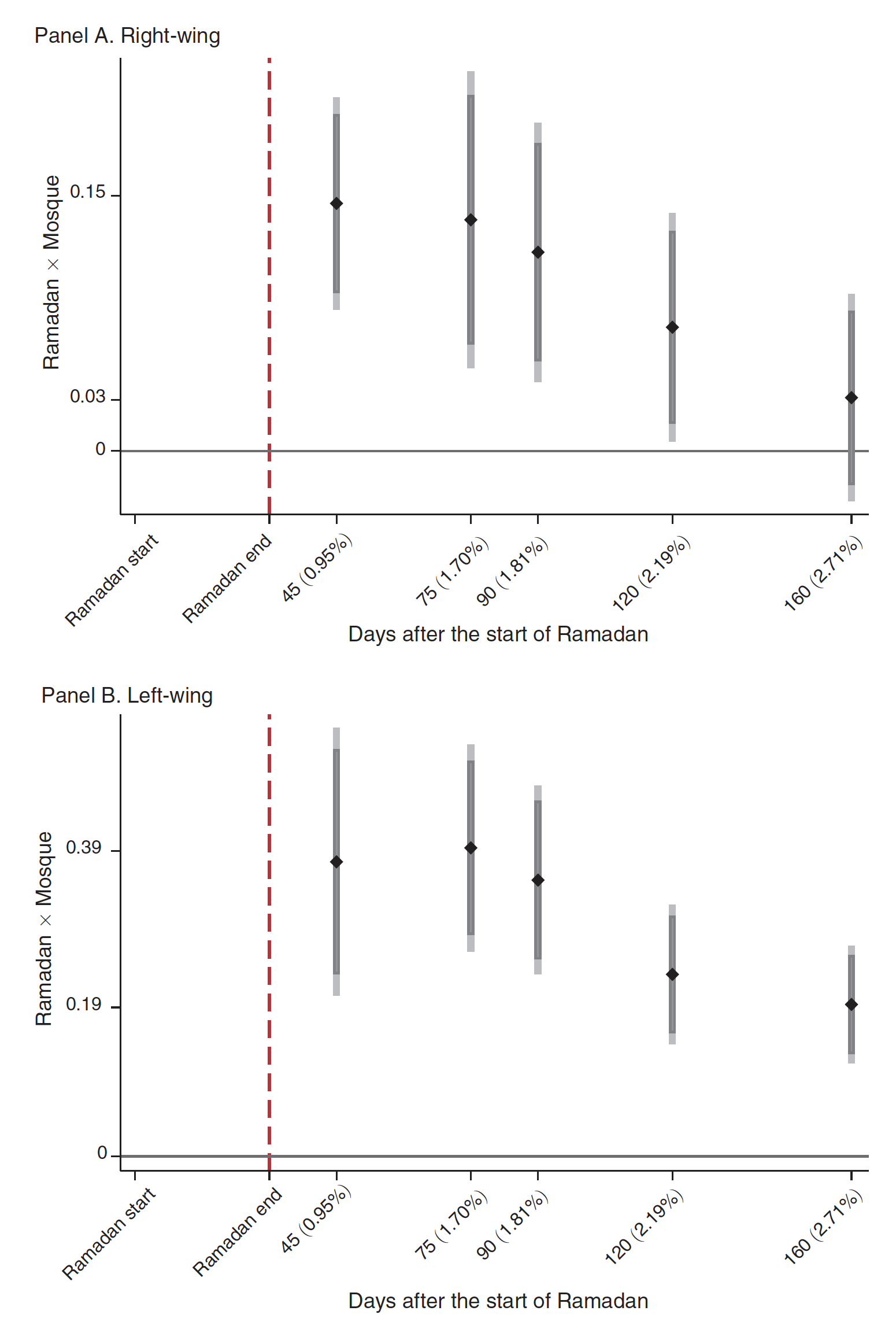 On average, if an election took place within three months after the start of Ramadan, right-wing parties in municipalities with a mosque had a vote share 13 percent of a standard deviation higher than ones without a mosque. The result was similar for left-wing parties—their share was 22 percent of a standard deviation higher in municipalities with mosques.