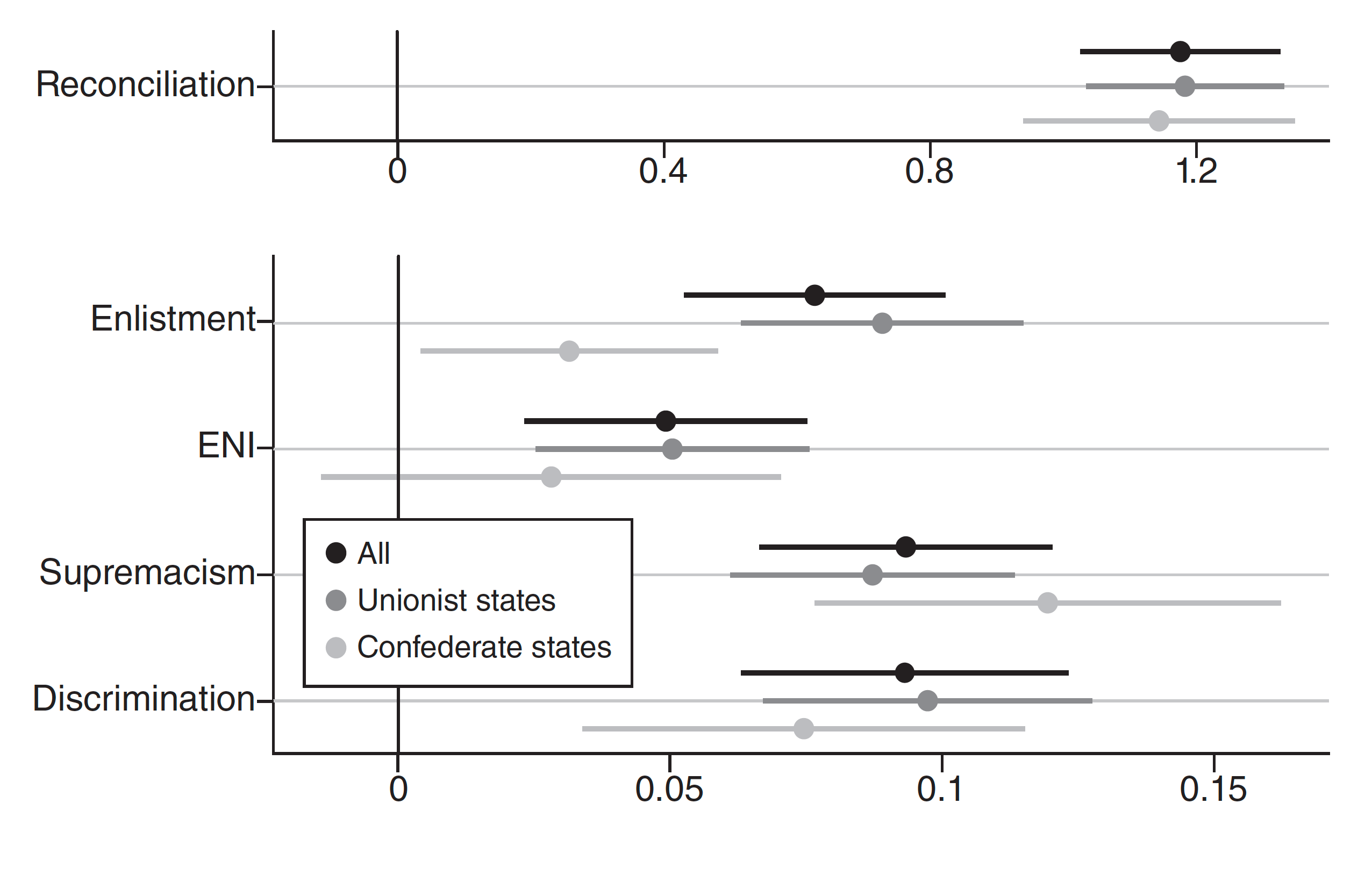 In the chart, the dark and light gray circles represent the effects of the movie on former Unionist and Confederate states respectively, while the black circles represent overall effects. All estimates are standardized.