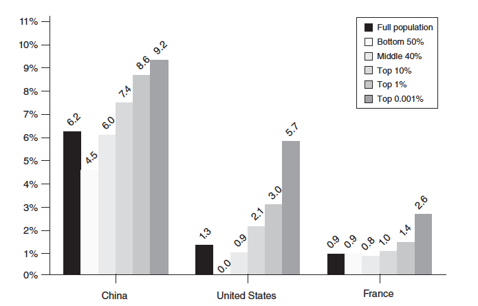 The figure above compares the distribution of income growth in China, the United States, and France over the period studied. In both China and the US, growth accruing to the bottom-50 percent (represented by the lightest grey bar) has been smaller than growth overall. Meanwhile, the top-10 percent in each country have gained an outsized share, even more so for the richest of the rich.