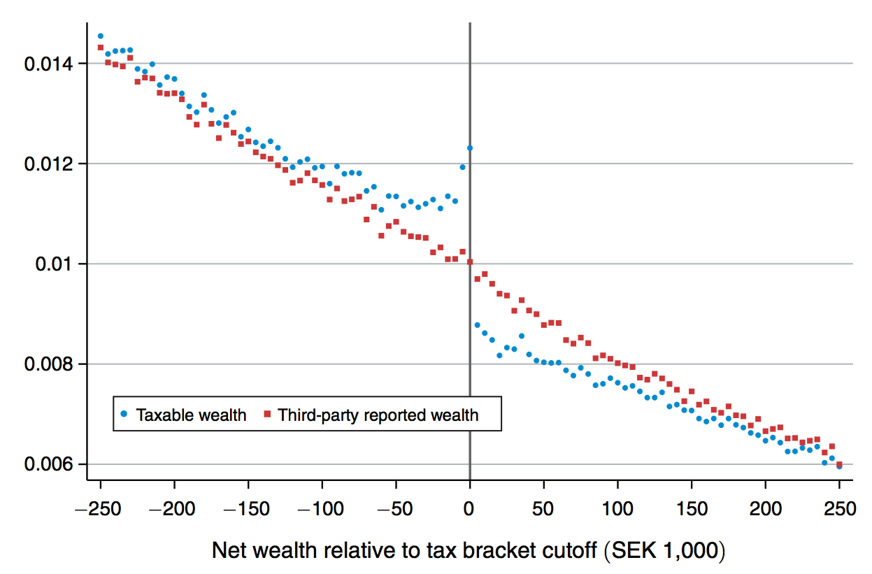 Seim found that, unlike third-party reported wealth, self-reported wealth increased right before the cut-off, as shown below in Figure 2. The disproportionate number of people who just barely fell below the threshold indicated that some individuals were manipulating their reports in order to avoid the tax.