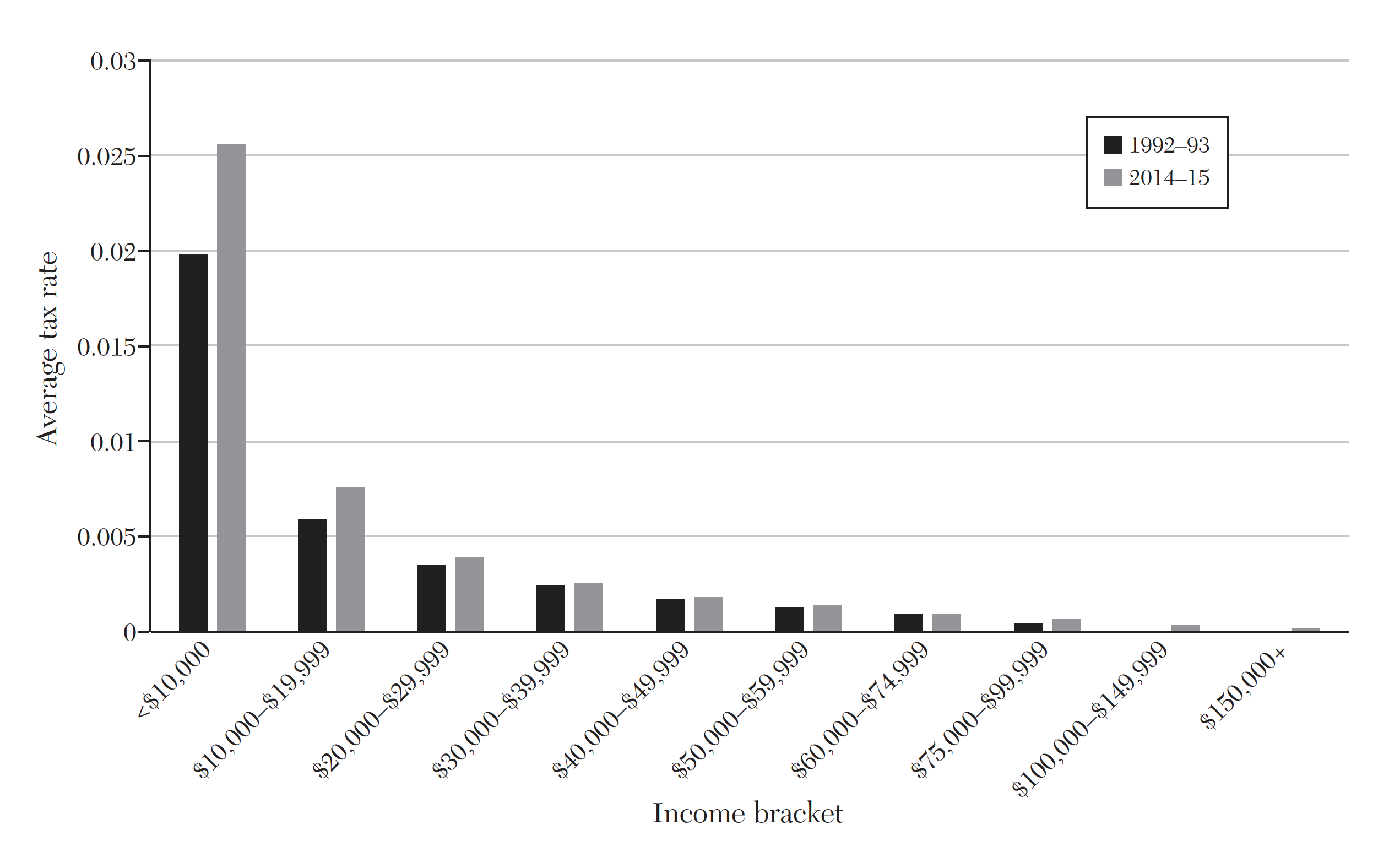 The chart represents the average tax rate for several income groups, which was calculated by dividing the total cigarette taxes paid by the median income point in each income bin. The black bars correspond to the period 1992–93, and the gray bars correspond to the period 2014–15.