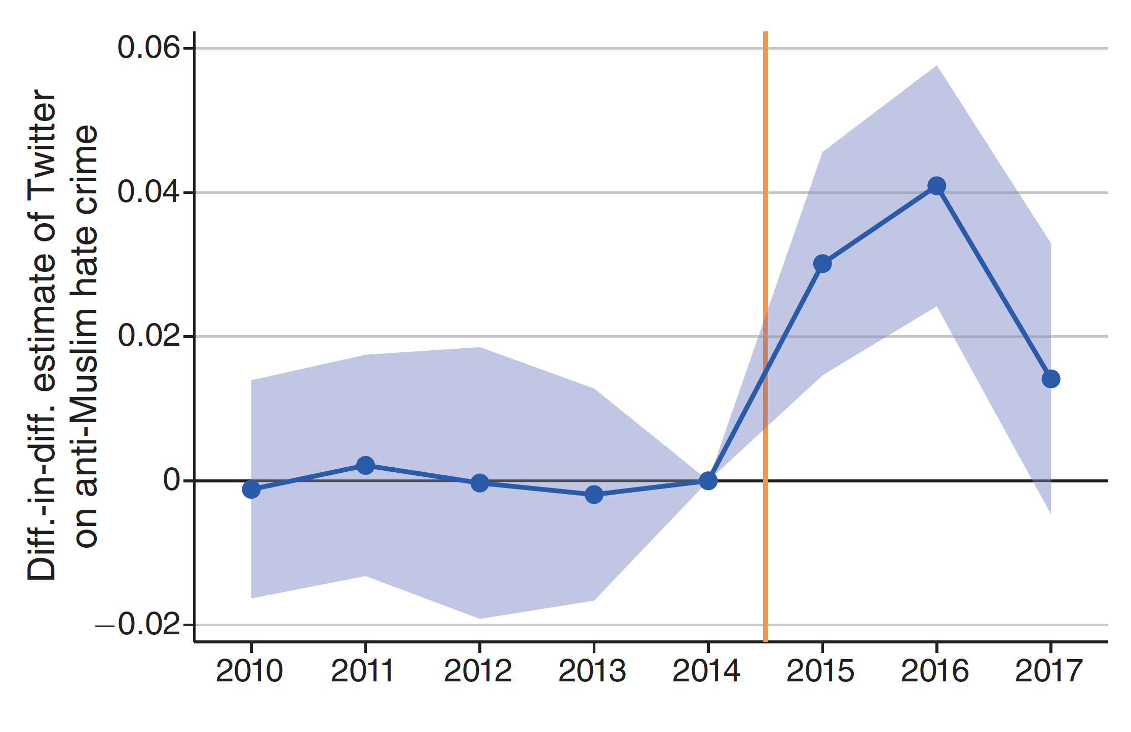 In a paper in the American Economic Journal: Applied Economics, authors Karsten Müller and Carlo Schwarz found evidence that higher Twitter use amplified an increase in anti-Muslim hate crimes after the 2016 presidential primaries—a period which saw an increase in inflammatory comments about Muslims by Donald Trump and his followers.