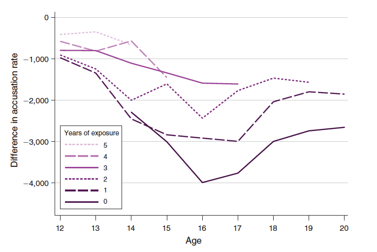 Figure 3 from their paper examines how it affected crimes committed by teens who were enrolled in the program when they were young compared to other kids in the rest of Canada. Quebec children had lower incidents of criminal accusations against them overall, represented by the negative numbers on the y-axis. But the gap between Quebec and the rest of Canada shrunk as children spent more years in the universal child care. Criminal accusations are lowest for the cohort of Quebec teens who spent no years in the program (represented by the solid purple line), and highest for the cohort that spent the most time in universal child care (the lightest lavendar dashed line).