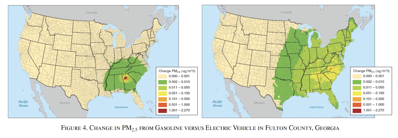 With conventional gas-powered cars (left map), the particulate matter emissions are more heavily concentrated in the immediate Atlanta metro area because the cars produce emissions where they are actually driving. With electric cars (right map), the particulate matter emissions aren’t as severe in any one county. But thanks to the interconnected power grid in the eastern U.S., areas as far away as Minneapolis or northern Maine suffer slightly worse air quality when electric cars in Atlanta power up. This “pollution export” phenomenon complicates the question of whether electric cars should be subsidized.