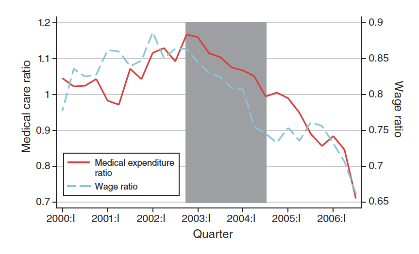 The figure above shows a correlation between how medical expenditures and earnings for injured workers changed after the reform. The red line represents the ratio of average medical expenditures for low back injuries relative to other injuries, such as shoulder or knee problems. Low back problems were becoming increasingly expensive to treat compared to other injuries, but then dropped dramatically after the reform went into effect (represented by the shaded region).