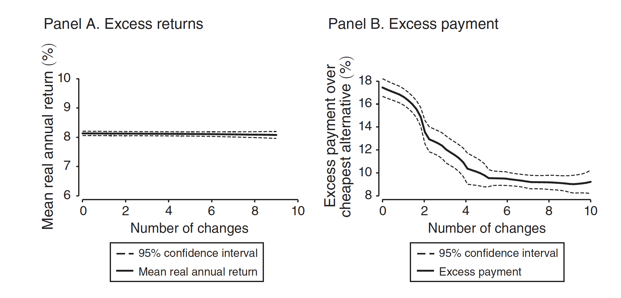These costs help to explain why less than half of enrollees switched pension funds between 1988 and 2001, despite significant changes in fees. Those who didn’t switch paid as much as 8 percentage points more in fees than those who switched multiple times, while getting the same returns.