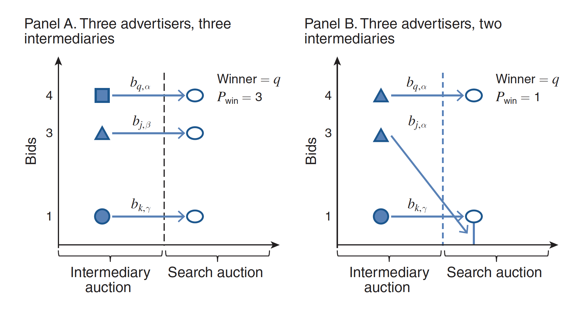 The chart below shows a simplified example of one way intermediaries can coordinate bids. Three advertisers (q, j, and k ) submit arbitrary bids ( bq = 4, bj = 3, and bk = 1 ) to an auction in which the winner pays the second highest bid held by the intermediary (α, β, or γ) to which they are affiliated. Intermediaries then bid in a search auction. In panel A, each advertiser has a different intermediary. In panel B, q and j share intermediary α. The arrows indicate how the intermediary translates the bids in its own auction into the bids placed on the search auction. In panel A, bids are passed without distortions; in panel B, j’s bid is reduced. In both cases q wins, paying the second highest bid which is either 3 (panel A) or 1 (panel B).