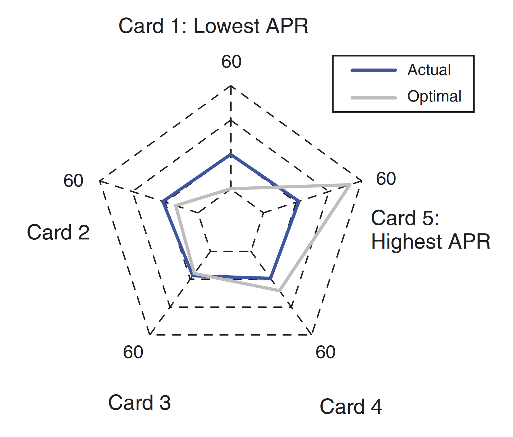 The blue line in the chart below shows the average percentage of total debt repayments split between five credit cards. While the average borrower put 20 percent on Card 1—the lowest-interest-rate card—they should have put 0 percent it and nearly 60 percent on Card 5—the highest-interest-rate card.