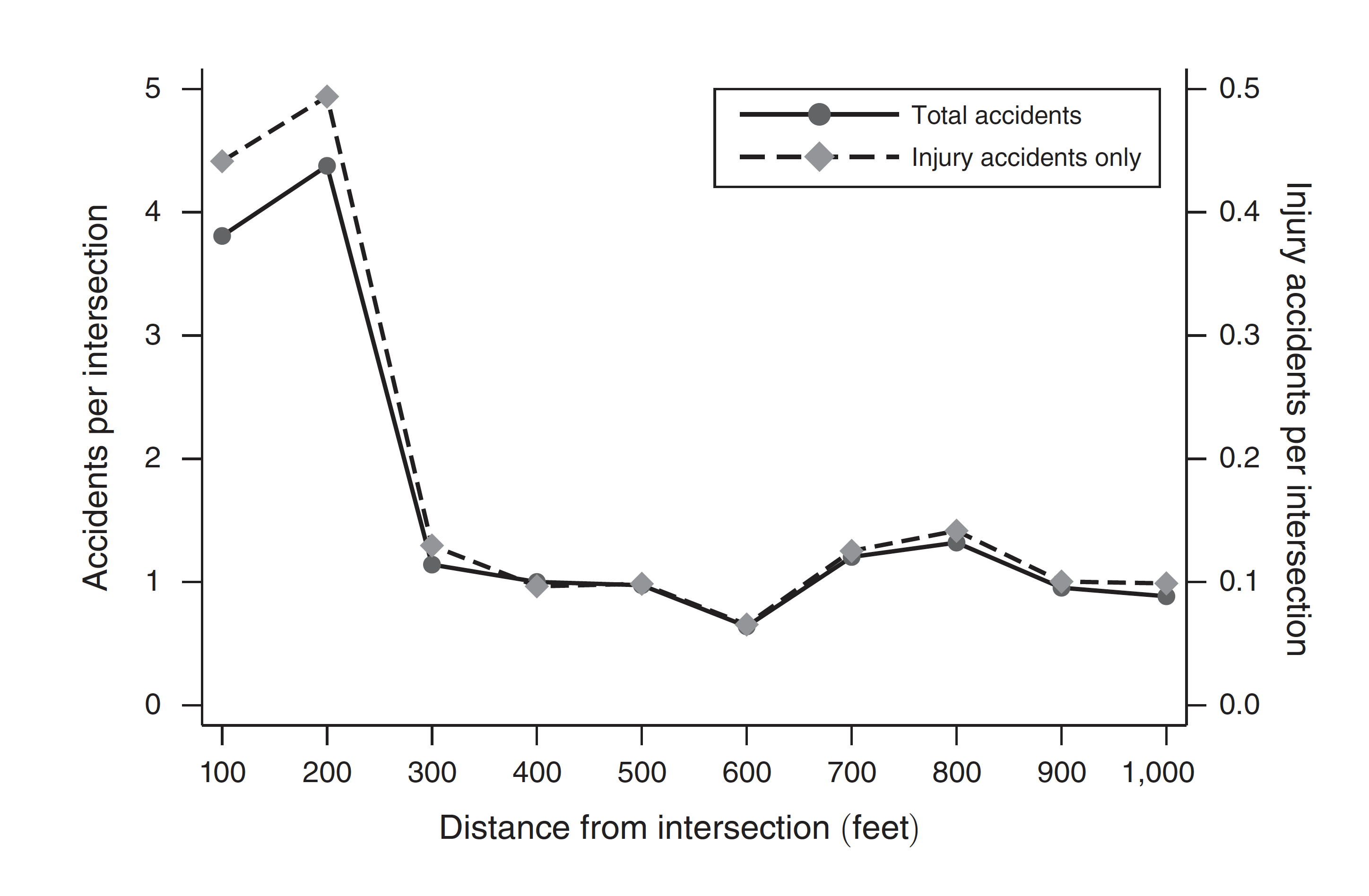 The figure below shows the yearly accidents at intersections (left axis) and those that resulted in an injury (right axis) by distance from a Houston intersection. More than three times as many incidents happen within 200 feet of an intersection than at any other distance.