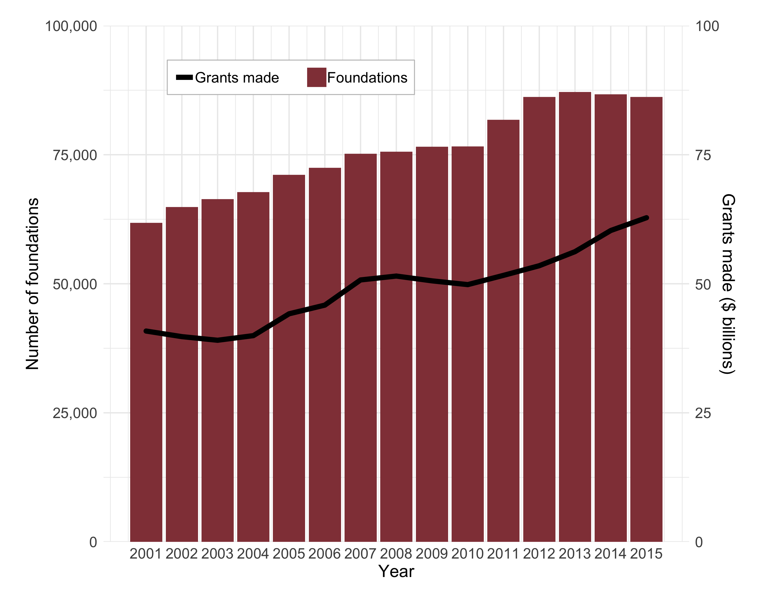 The chart below shows the growing trend in the number of US foundations and the amount of money they disburse. Over $60 billion in grants were given out in 2015.