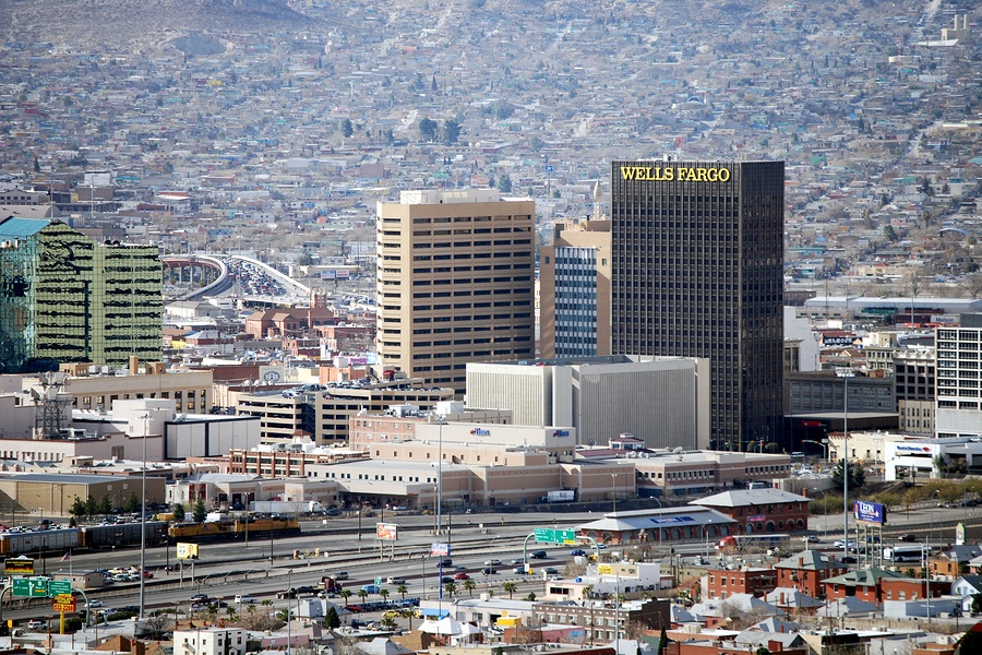 Downtown El Paso, Texas, with a view of Ciudad Juárez, Mexico in the background, pictured in 2008. Cities in northern Mexico with easy access to the American market have become centers of the maquiladora economy.