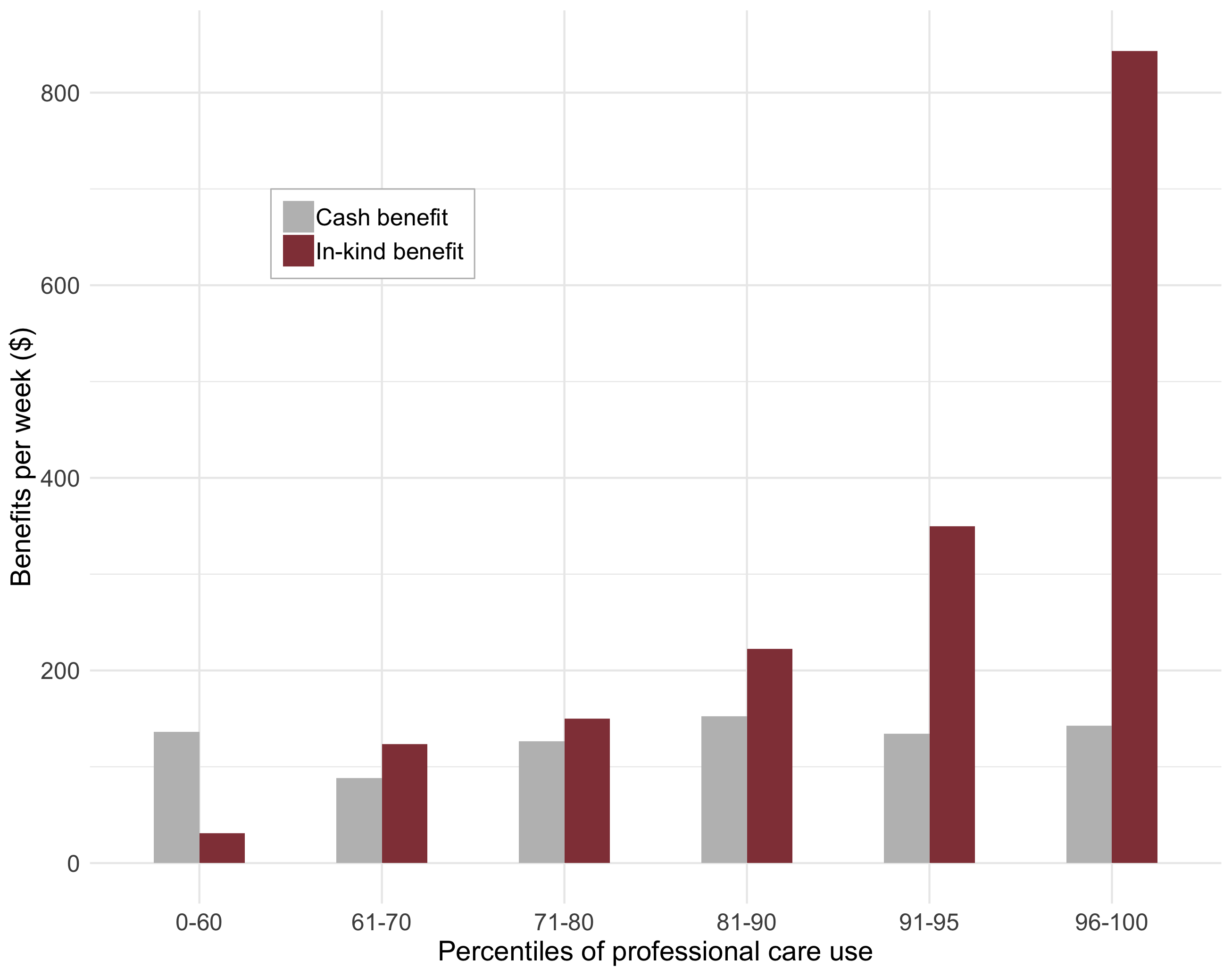 The chart below shows the average dollar amount of benefits received per week on the y-axis, and percentiles of professional home care use for cash and in-kind recipients on the x-axis. For example, recipients using less than the sixtieth percentile of professional home care received on average $136 a week in cash and $30 a week in in-kind benefits.