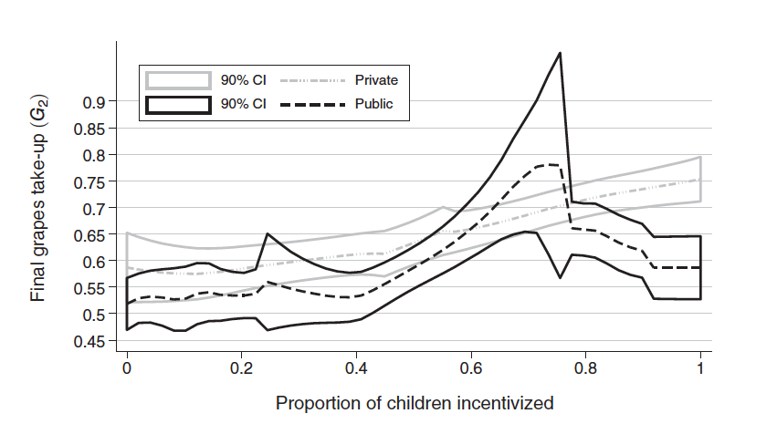 Unsurprisingly, the incentive worked, leading to a 53 percent increase in the share of incentivized kids who chose grapes. It also had spillover effects, leading their friends to choose grapes too.