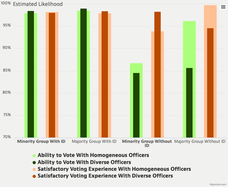 Whether this happens because majority officers are lenient with majority voters or because minority officers are strict is ambiguous. Either way, when only majority officers are present, majority voters who do not have voter ID cards are more likely to be allowed to vote.