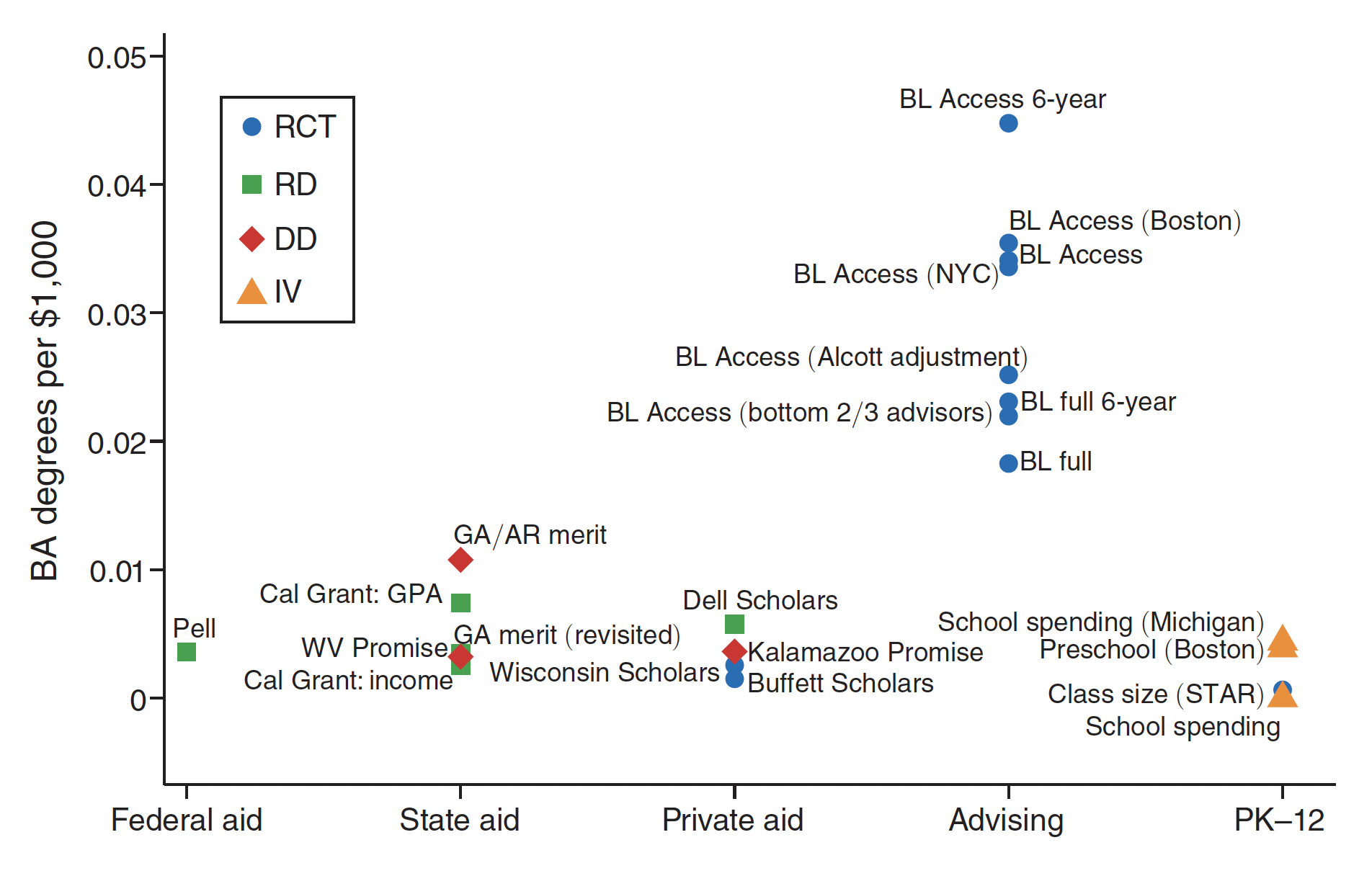 Helping students with the college application process also proved to be cost-effective. At roughly $2,000 per student for precollege advising, the intervention generated approximately 0.03 additional bachelor's degrees per $1,000 spent, with consistent effects across sites, cohorts, and advisors. By comparison, financial aid programs typically produce less than 0.01 additional degrees per $1,000.