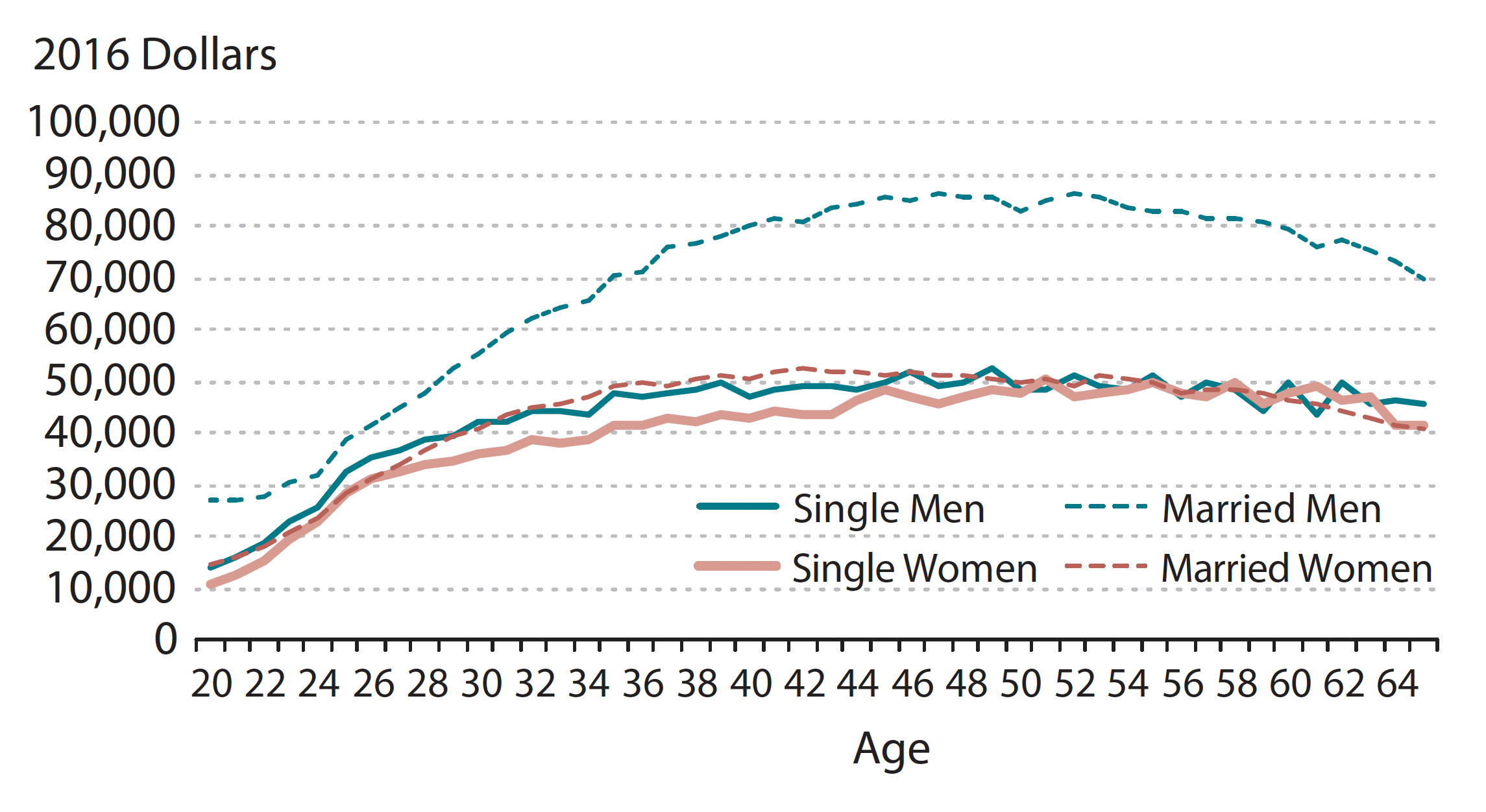 In the United States, married men sit atop the wage ladder. At every age, they earn a significant premium over their bachelor counterparts. Some speculate that this is because marriage makes men more productive, while others point out that high-income earners are more attractive partners.