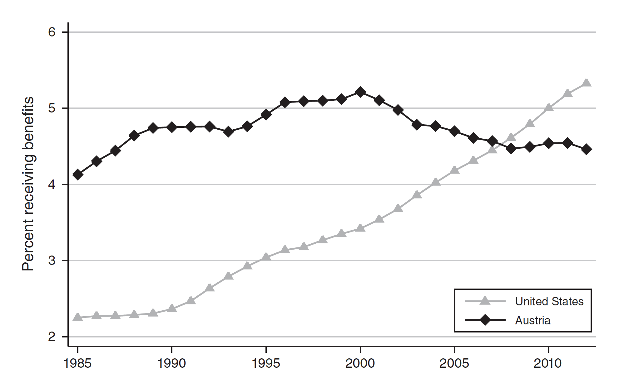 The chart below shows the share of twenty-five- to sixty-four-year-olds on disability in Austria and the US. The share of Austrians on disability has declined from a high of over 5 percent since the late 90s, but remains high. And disability benefits in the US have only become more and more important to Americans.